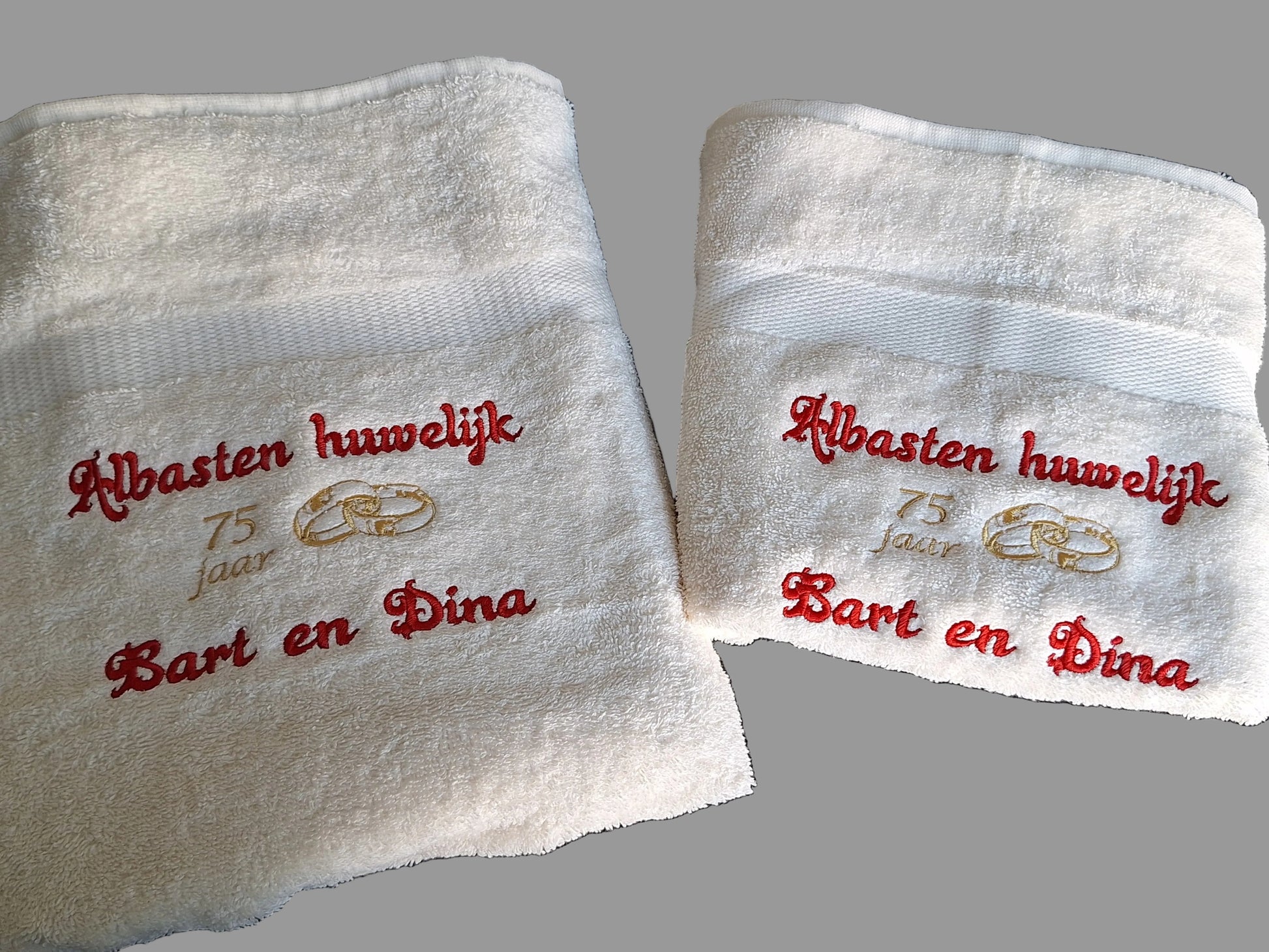 Een handdoek of badlaken met de tekst Albasten Huwelijk, de namen van het stel en het jubileumjaar is een stijlvol en persoonlijk geschenk. Veel klanten kiezen bij dit ontwerp voor lichtcrème of ivoorkleurig garen, kleuren die de elegantie en tijdloosheid van albast prachtig weerspiegelen.