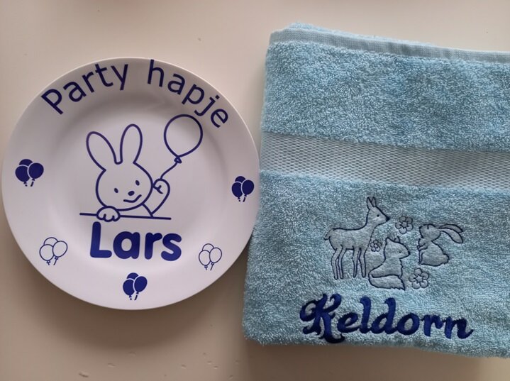 De handdoek met naam wordt geborduurd met een naam en afbeelding, waardoor het een uniek bedankt cadeau wordt.
