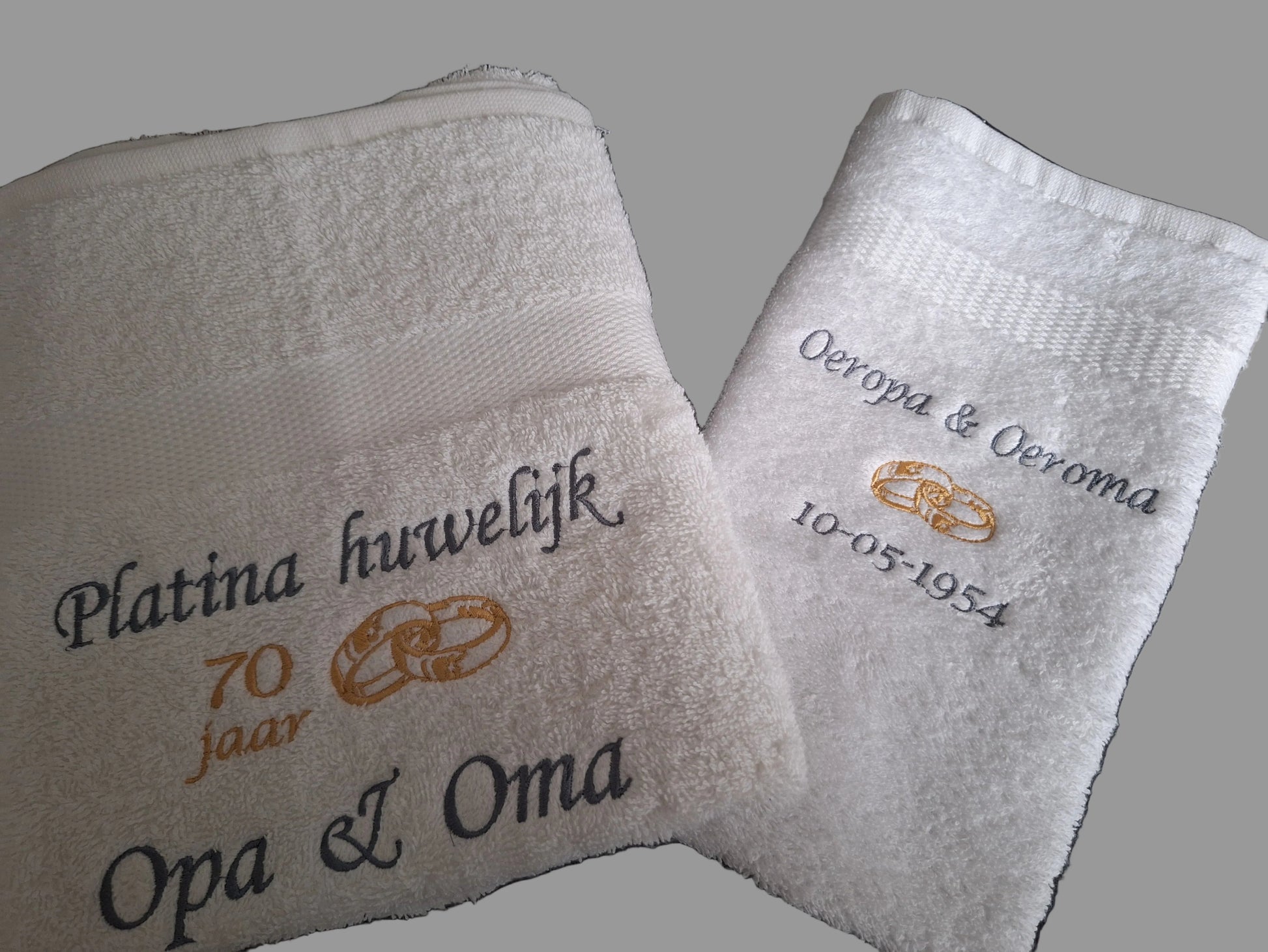 Een handdoek of badlaken met de tekst Platina Huwelijk, de namen van het stel en het jubileumjaar is een stijlvol en betekenisvol geschenk. Veel klanten kiezen bij dit ontwerp voor platina-grijs of zilverachtig garen, kleuren die de elegantie en het exclusieve karakter van platina weerspiegelen.
