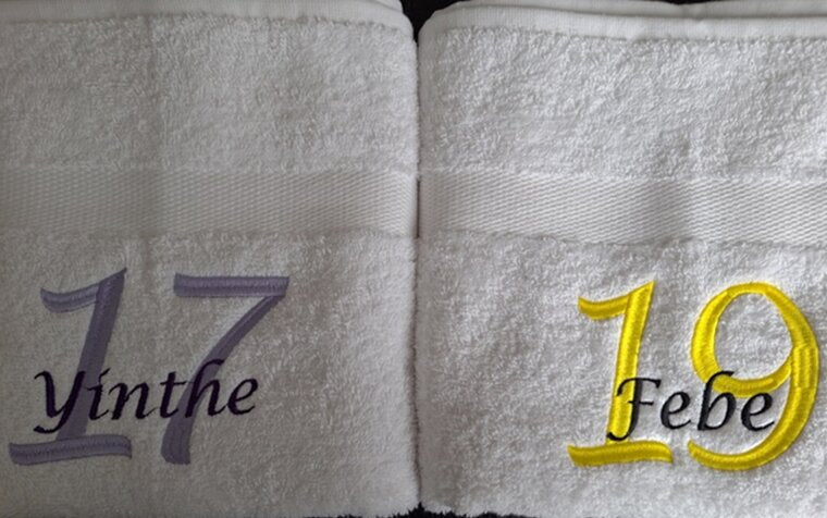 Tijdens het bestellen bepaal je zelf de naam en de kleuren van de borduring. Voor een opvallend en vrolijk resultaat raden wij contrasterende kleuren aan. Populaire combinaties zijn: