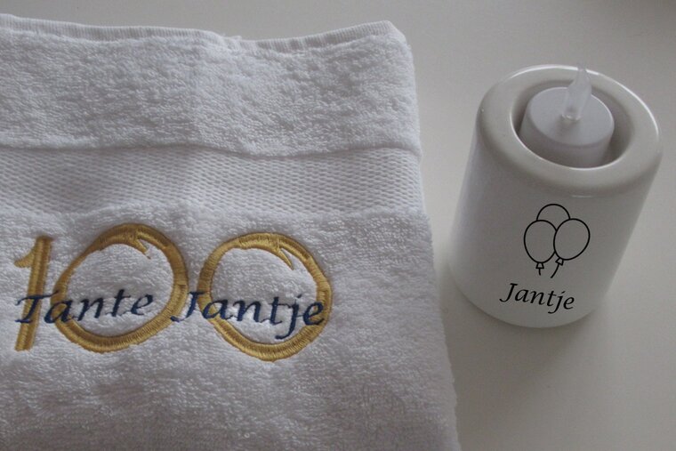 Wordt iemand binnenkort 100 jaar? Dan is deze handdoek 100 jaar met naam en leeftijd het ultieme cadeau voor deze uitzonderlijke mijlpaal! De leeftijd 100 wordt standaard groot op de handdoek geborduurd, met de naam van de jarige er stijlvol doorheen verwerkt. Andere leeftijd? Wil je een andere leeftijd laten borduren? Dit is ook mogelijk, maar deze opties zijn niet standaard beschikbaar. Neem in dat geval even contact met ons op om de mogelijkheden te bespreken.