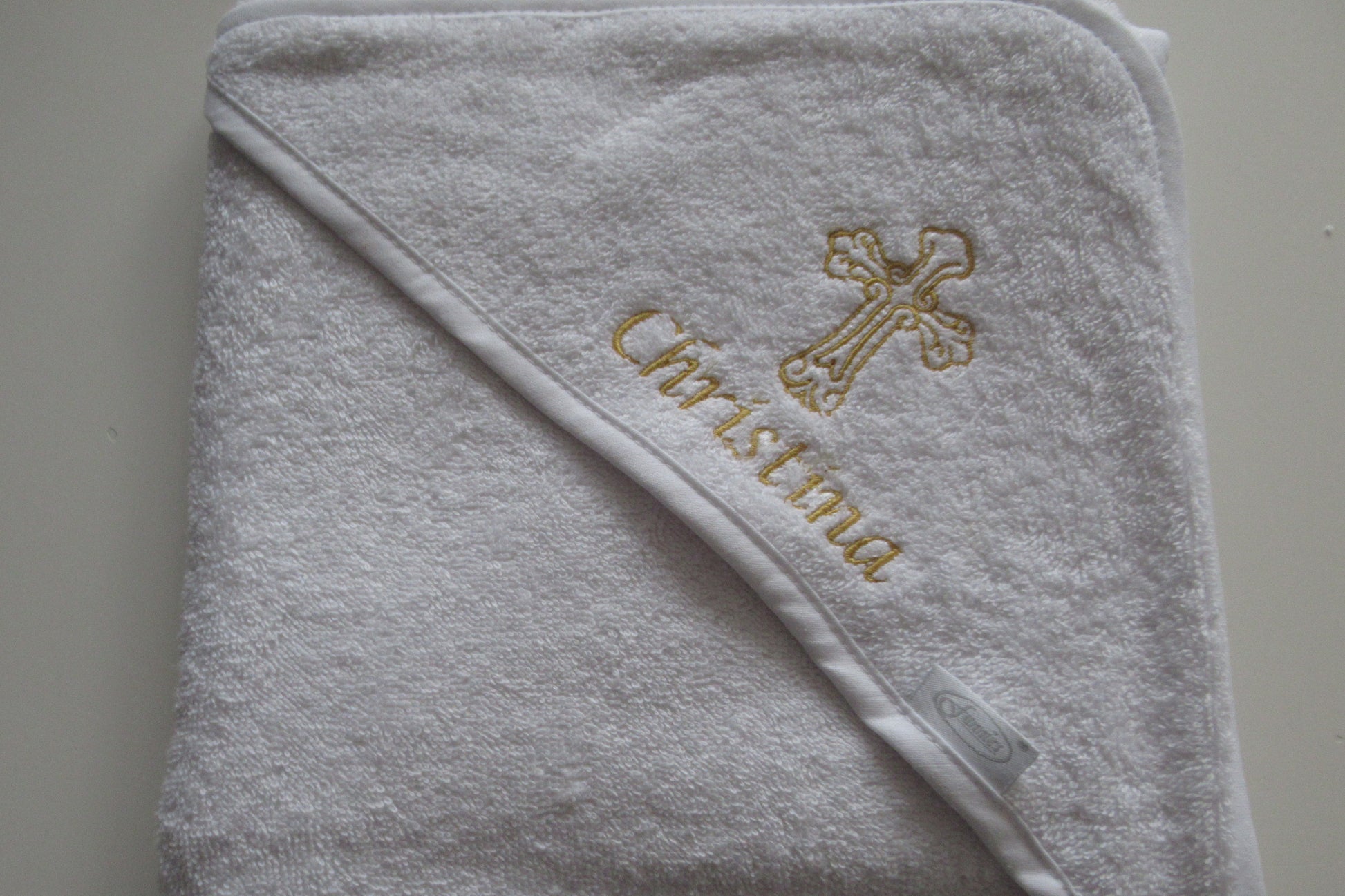 Zo maak je in een paar stappen een mooie baby badcape met kruis dat met zorg speciaal voor jou wordt geborduurd.