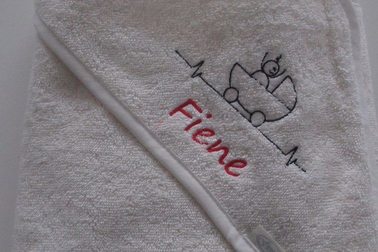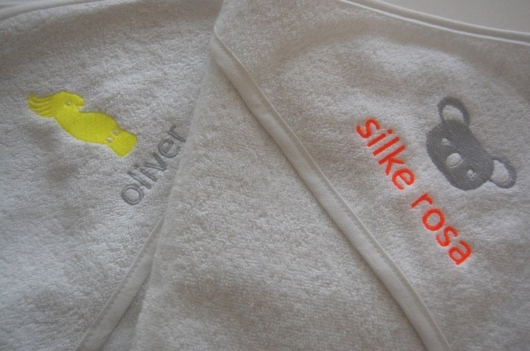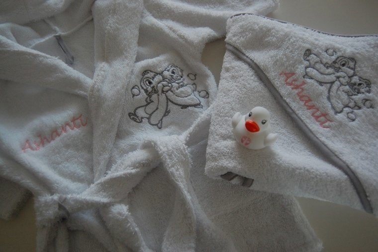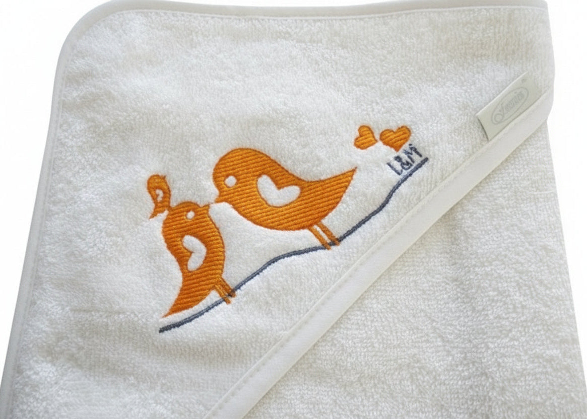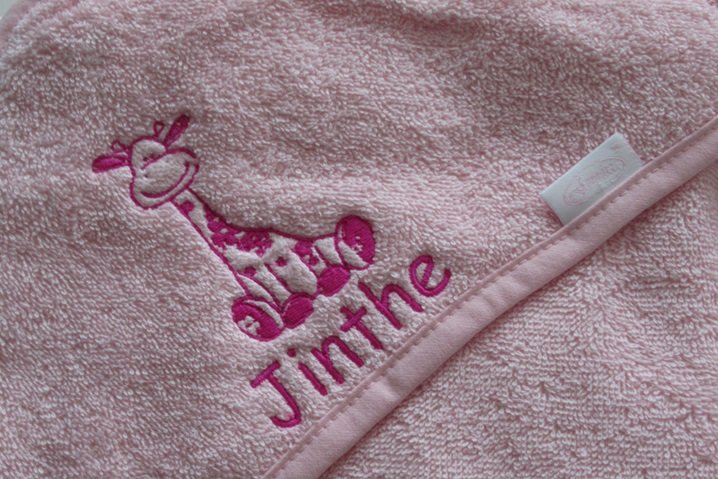 Wij leveren badcapes van zachte, duurzame badstof, die ideaal zijn om te borduren of te bedrukken met digitale print. Je kunt kiezen of je alleen een afbeelding wilt laten plaatsen, een afbeelding in combinatie met de naam van het kindje, of meerdere elementen zoals geboortedatum en logo.