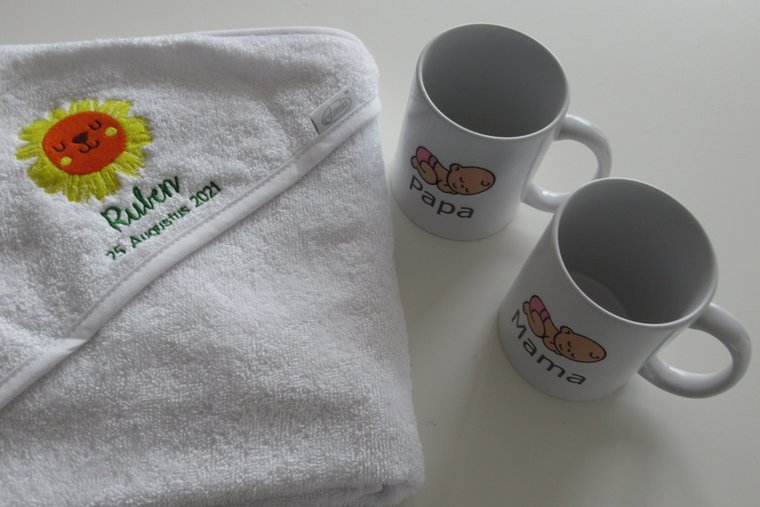Maak het cadeau extra bijzonder door de badcape te combineren met een slabber, spuugdoekje, knuffeldoek of kinderdrinkmokje met naam of logo. Zo creëer je een compleet gepersonaliseerd kraampakket.