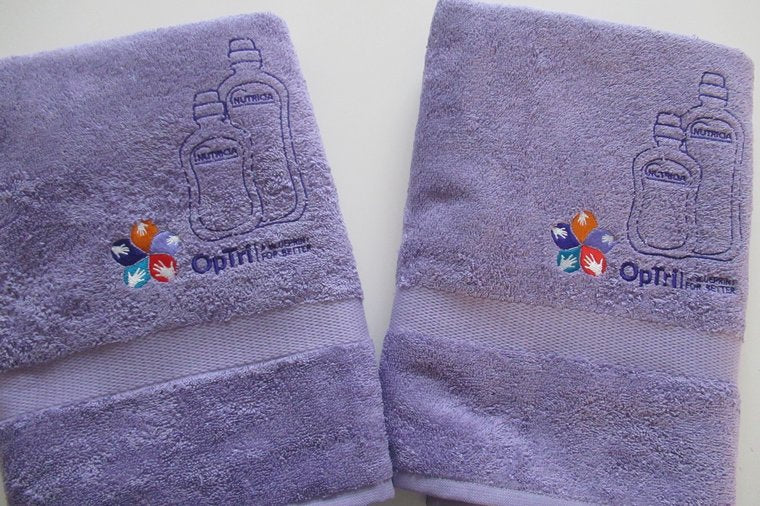 De meeste klanten kiezen ervoor om hun logo op een wit badlaken of douchlaken te laten borduren, maar we bieden ook veel andere kleuren aan, zoals ecru, zwart, rood, roze, blauw, paars, grijs en nog veel meer.