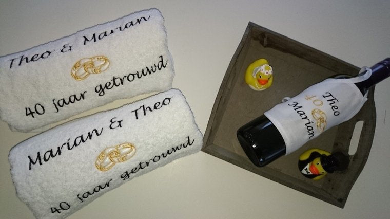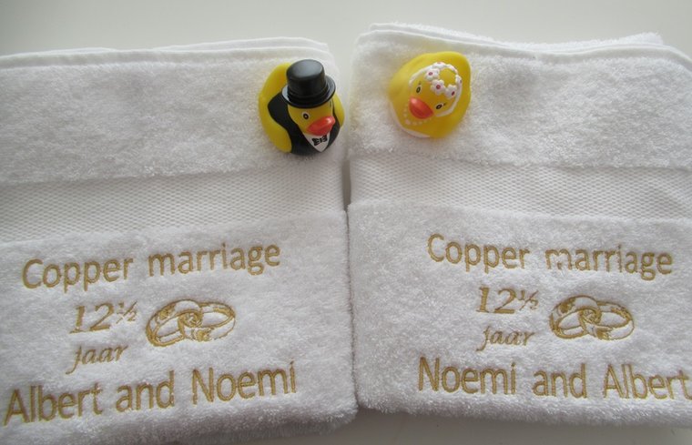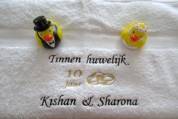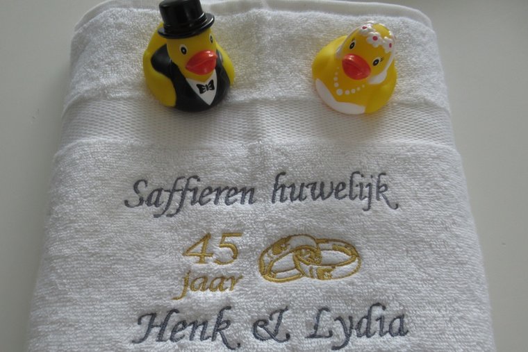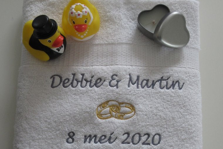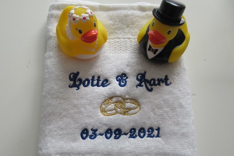 Elk setje is compleet met charmante details zoals een sluier, hoed of strikje, waardoor het direct een persoonlijk en speels cadeau wordt. Ze zijn perfect als kleinigheidje, of om toe te voegen aan een cadeaumand met andere huwelijkscadeaus. Veel klanten combineren de badeendjes met onze gepersonaliseerde huwelijkshanddoeken met naam en trouwdatum, jubileumhanddoeken of andere gepersonaliseerde geschenken, voor een extra bijzonder effect.