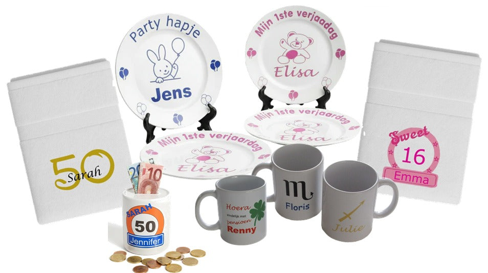 - een slabber of spuugdoekje, met naam en delftsblauwe afbeeldingen