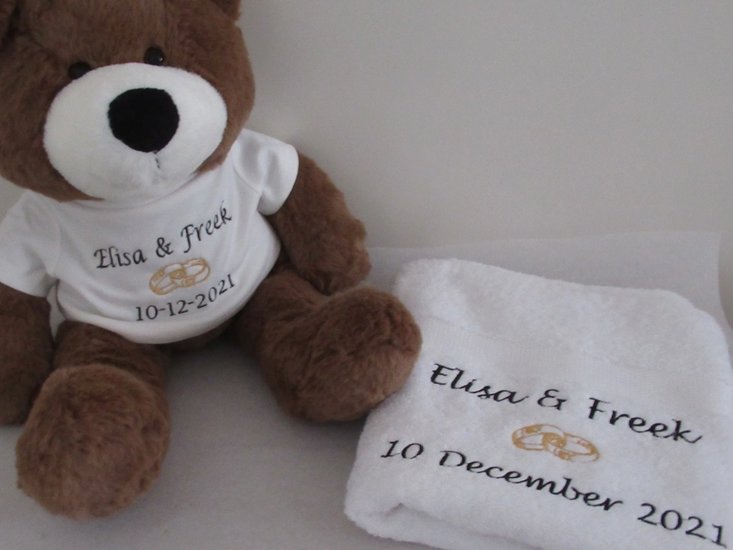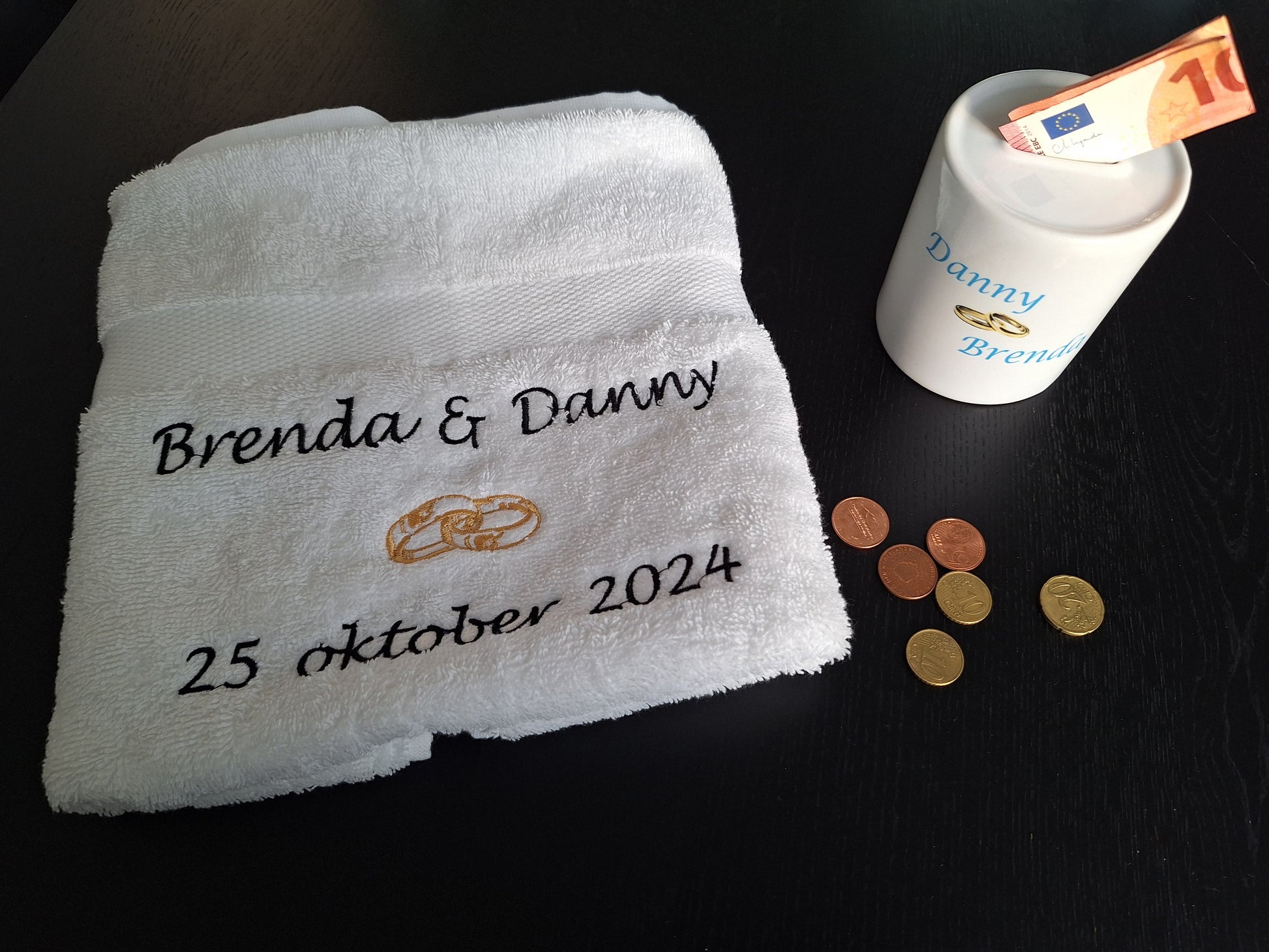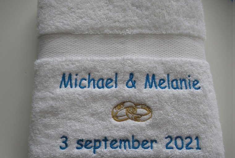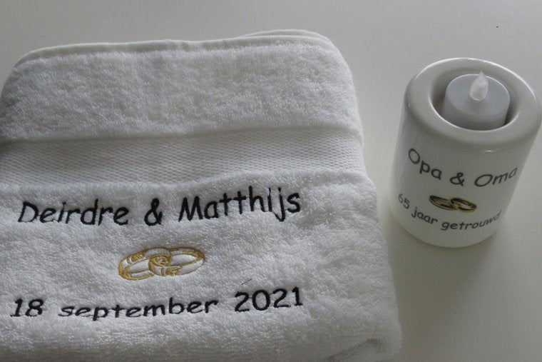 Een handdoek of badlaken met namen en trouwdatum is zowel praktisch als emotioneel. Het is een dagelijks bruikbaar item en een blijvende herinnering aan één van de belangrijkste dagen in het leven van het bruidspaar. Of je nu één stuk bestelt of een volledige cadeauset samenstelt, dit cadeau valt altijd in de smaak en wordt vaak jarenlang bewaard.