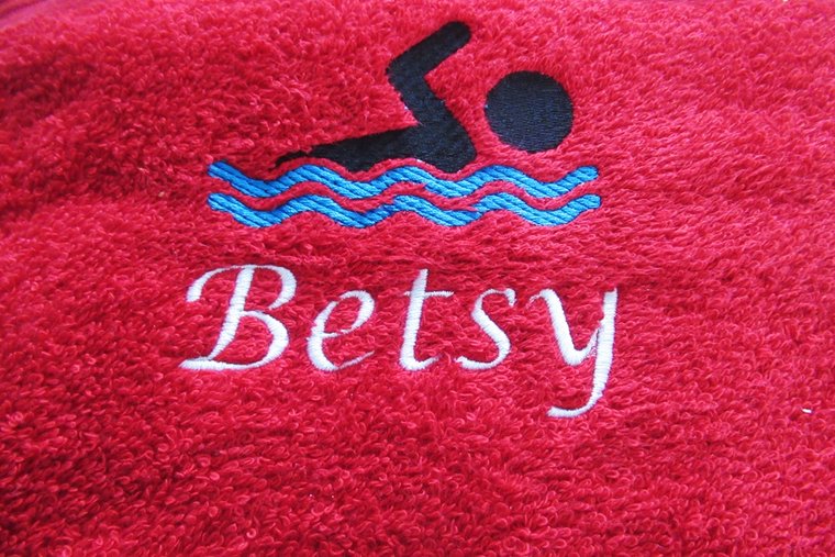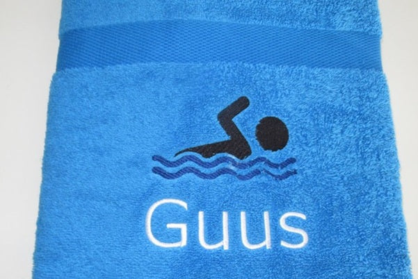Iedere zwem handdoek wordt standaard geborduurd met een sportief symbool van een zwemmer. Dit maakt de handdoek extra herkenbaar en passend bij de sport. Het symbool van de zwemmer is bij dit product standaard, maar als je liever een andere sportafbeelding of sporticoon wilt, kun je vrijblijvend contact opnemen om de mogelijkheden te bespreken.