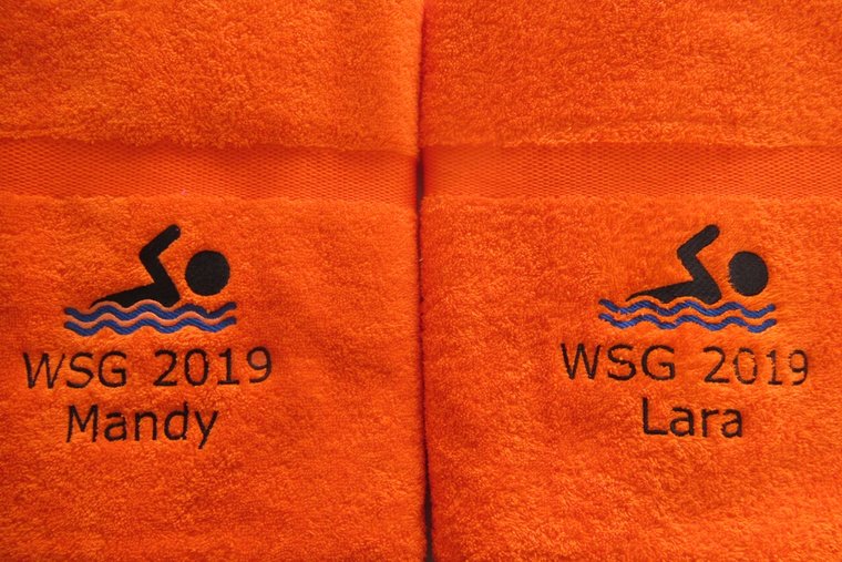 De meeste klanten kiezen ervoor om de handdoek te laten borduren met een naam, omdat dit het cadeau direct persoonlijk en uniek maakt. Natuurlijk is het ook leuk om initialen of een korte tekst toe te voegen, zoals SPLASH, TEAMSWIM of WINNER – zo maak je de handdoek helemaal eigen.