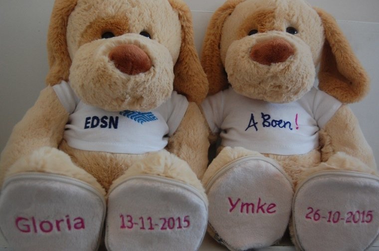 Wil je een knuffel zonder logo, maar alleen met naam en datum? Dat kan uiteraard ook.