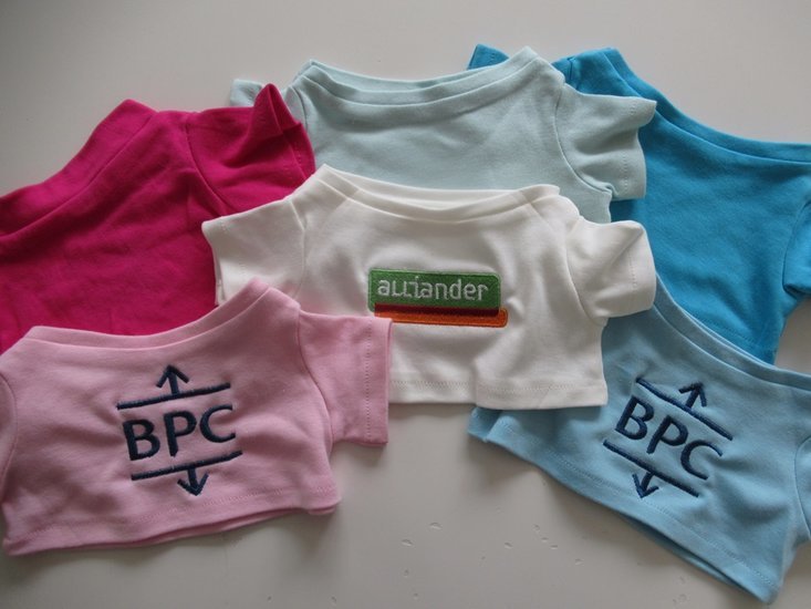 Knuffel met shirtje: het logo kan op het shirtje geborduurd worden. Borduuropties: Alleen het logo (handig als je meerdere knuffels op voorraad wilt hebben, zodat je ze snel kunt overhandigen) of Logo + naam van het kind erboven of eronder.