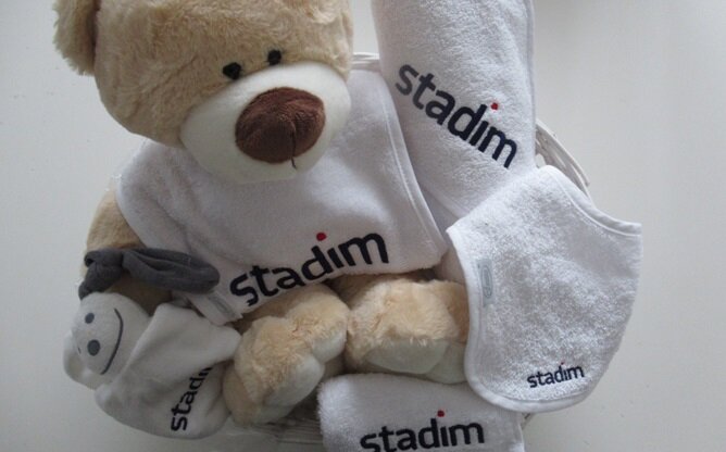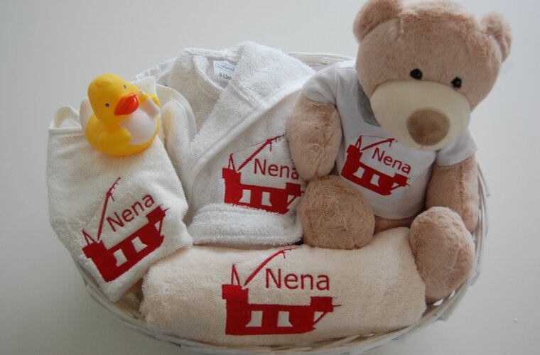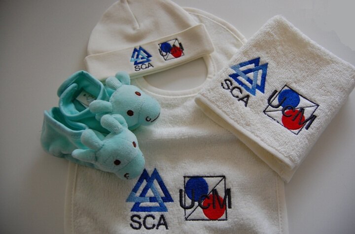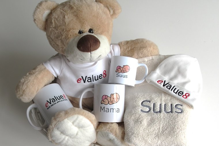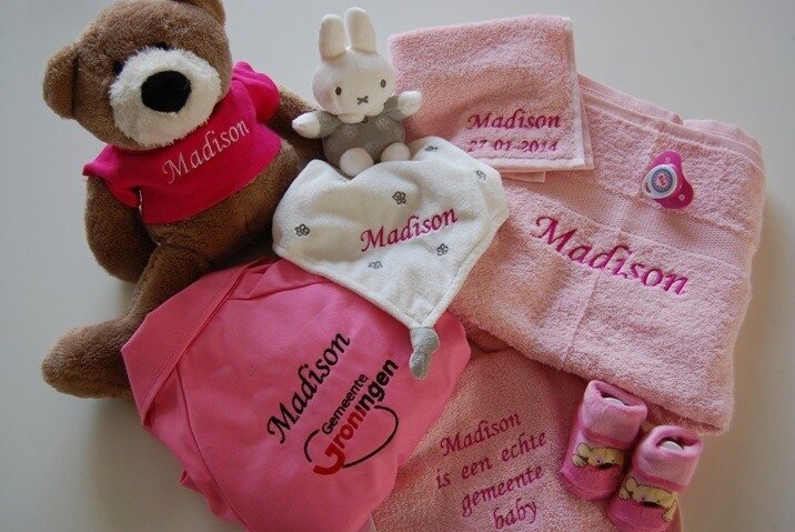 Je kunt kiezen uit onder andere: Babymuts, spuugdoek, slabber, bandana, knuffelpop, romper, handdoek, tutdoekje, fleece wikkeldeken, knuffelbeer, geboortebeer, babybadjas, badcape, kinderponcho, spaarpot, kinderdrinkmok, bloempot met baby-gelukwens bloemzaadjes of een kinderbroodbordje. Al deze artikelen kunnen worden voorzien van logo, naam of naam én logo.