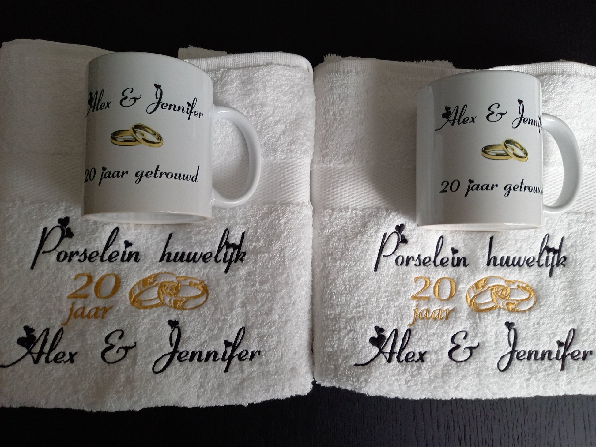 Een gepersonaliseerde handdoek of badlaken met de tekst “Porselein Huwelijk”, het jubileumjaar 20 jaar en de namen van het stel is een stijlvol en betekenisvol cadeau dat perfect past bij deze bijzondere gelegenheid.