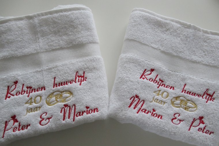 Onze handdoeken en badlakens met namen, gouden ringen en de tekst “Robijnen huwelijk – 40 jaar getrouwd” zijn daarvoor perfect. De namen en tekst worden geborduurd in een kleur garen naar keuze — veel klanten kiezen voor een rode kleur garen omdat past bij robijnrood, als prachtig symbool voor passie, liefde en de vurige kracht van een huwelijk dat al vier decennia standhoudt.