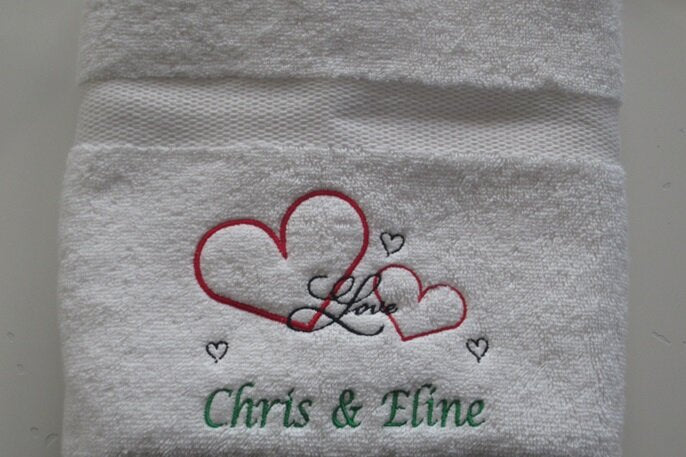Wil je een origineel en liefdevol cadeau geven dat praktisch is en een blijvende herinnering vormt? Met onze handdoek of badlaken “Forever in Love” met twee rode hartjes, drie zwarte hartjes en de tekst Love kun je de namen van twee personen borduren. Dit romantische cadeau is perfect voor allerlei gelegenheden, zoals verloving, Valentijnsdag, trouwdag, jubileum of gewoon om je liefde te laten zien. 💖