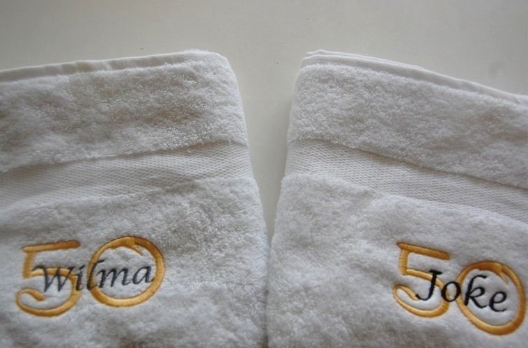 Naast de naam kun je ook zelf de kleuren van het borduurwerk kiezen. Zowel het getal 50 als de naam krijgen hun eigen kleur, waardoor de handdoek nog persoonlijker wordt. Wij adviseren om te kiezen voor contrasterende kleuren, zodat de borduring mooi naar voren komt. Populaire keuzes zijn: