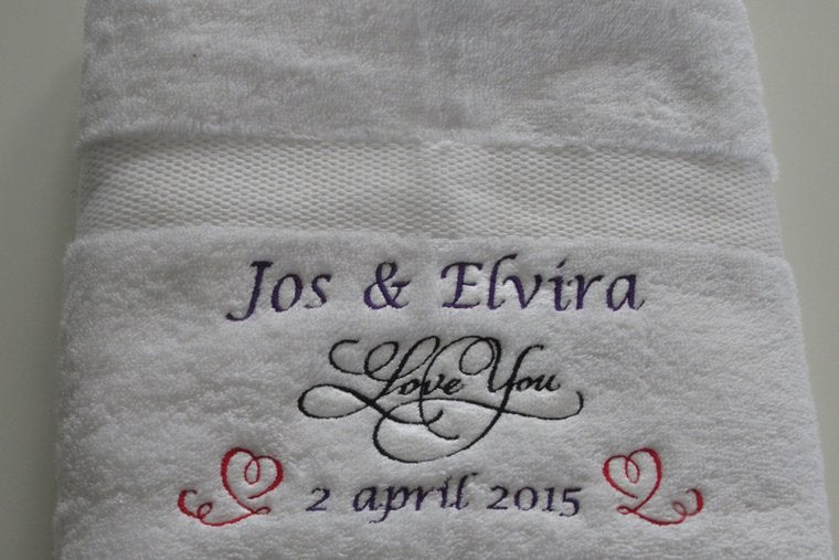 Wil je jouw partner op Valentijnsdag verrassen met een origineel en persoonlijk cadeau? Onze handdoek of badlaken “Valentijnscadeau met Namen” is een stijlvol geschenk dat liefdevol en praktisch tegelijk is. Het ontwerp toont de tekst Love You in het midden, met de mogelijkheid om boven de tekst de namen van twee personen te borduren en onder de tekst een speciale datum tussen twee hartjes. Perfect voor een romantische verrassing op Valentijnsdag, maar ook geschikt voor verloving, jubileum, trouwdag of gewoon om je liefde te laten zien. 💖