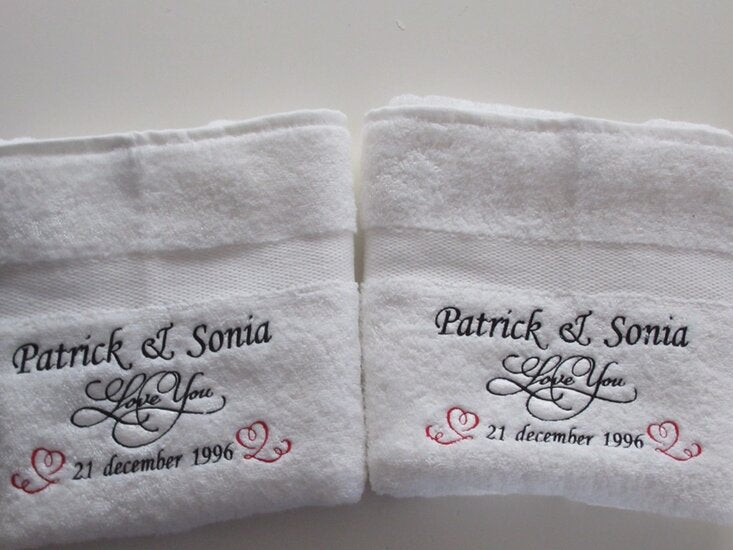 Voor het personaliseren kies je eerst het gewenste formaat: handdoek of badlaken. Beide zijn per stuk verkrijgbaar, maar veel klanten bestellen twee stuks – één voor hem en één voor haar – zodat jullie samen een stijlvol gepersonaliseerd setje hebben.