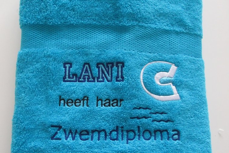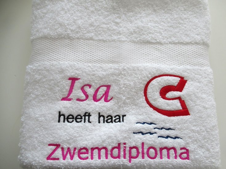 Met deze handdoek geef je een blijvende herinnering aan het behalen van zwemdiploma C. Ieder kind zal trots zijn zijn naam op deze persoonlijke handdoek te zien. Bestel vandaag nog en vier het grote finale-moment in stijl!